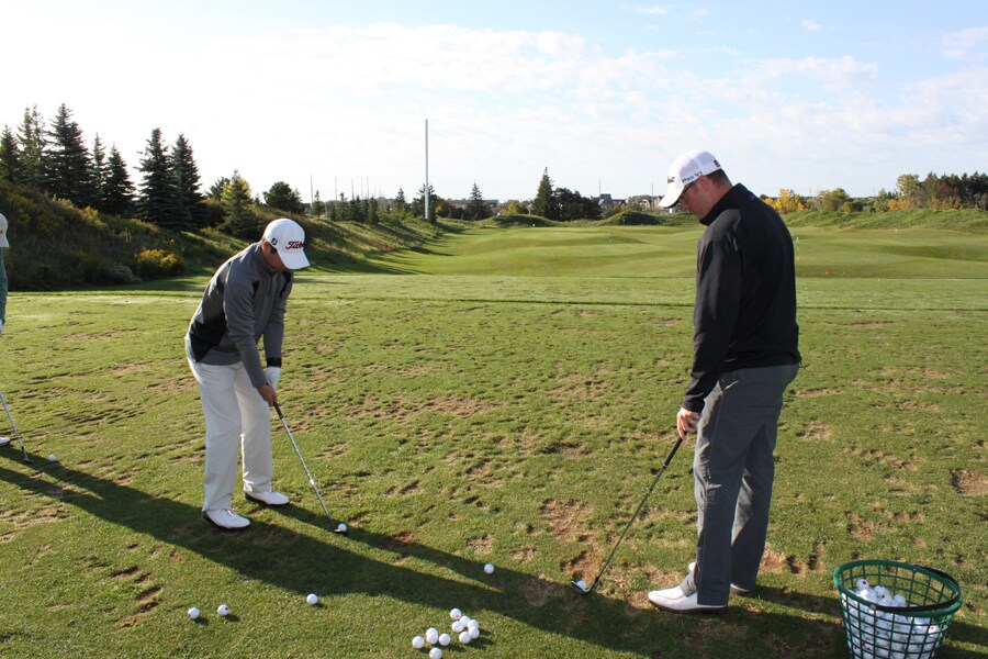 Matt and Sean keeping warm as they fire some Pro V1x's down the range.