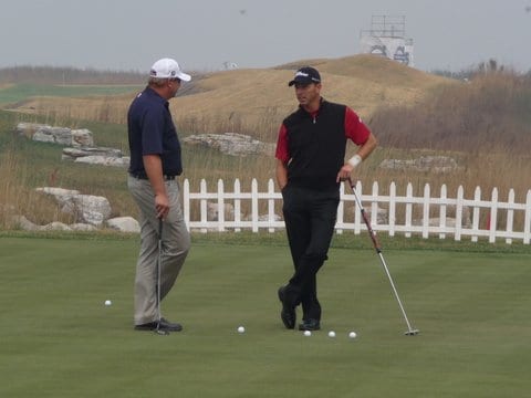 Staffers Soren Hansen and Michael Jonzon catch up on the putting green