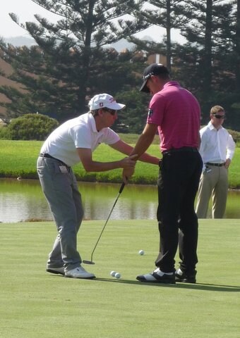 Staffer Romain Wattel tries something new on the putting green with his coach