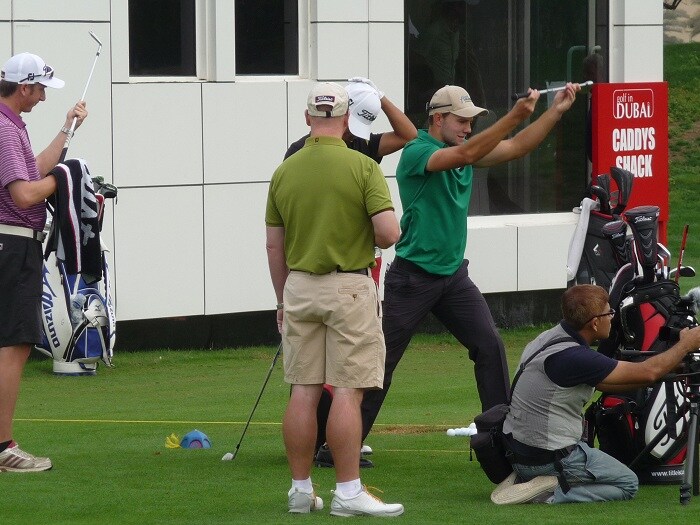 And Titleist ambassador Max Kieffer makes sure he stretches well ahead of a range session