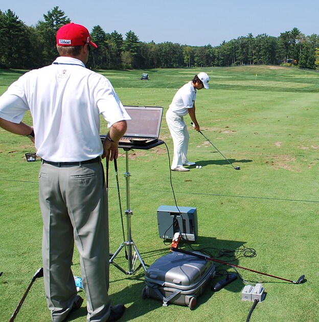 Director of Tour Promotions Chris Tuten checks Na's numbers on the TrackMan launch monitor.