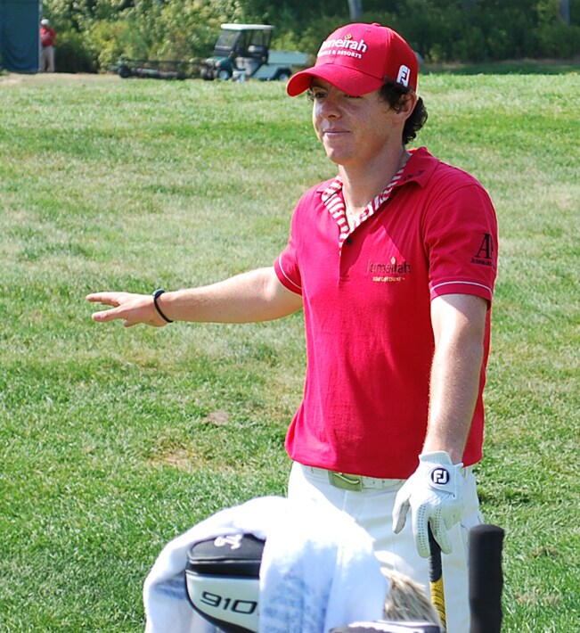 Titleist Brand Ambassador Rory McIlroy talks to his caddie on the range.