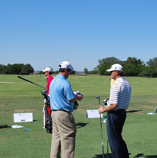 Here Anderson (right) speaks with Titleist Tour Rep Jim Curran.