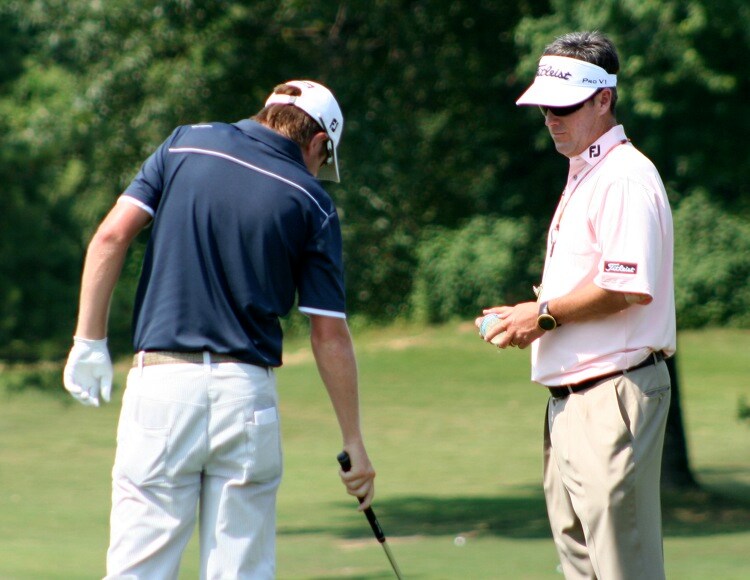 Titleist Tour Rep Jim Curran (right) checks in with Titleist Brand Ambassador Aaron Price.