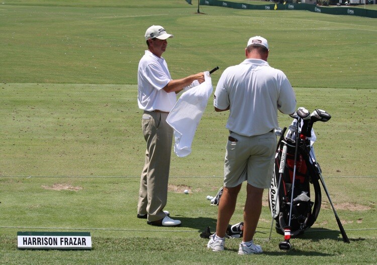 Titleist Brand Ambassador Harrison Frazar wipes down his grips on the humid AAC range.