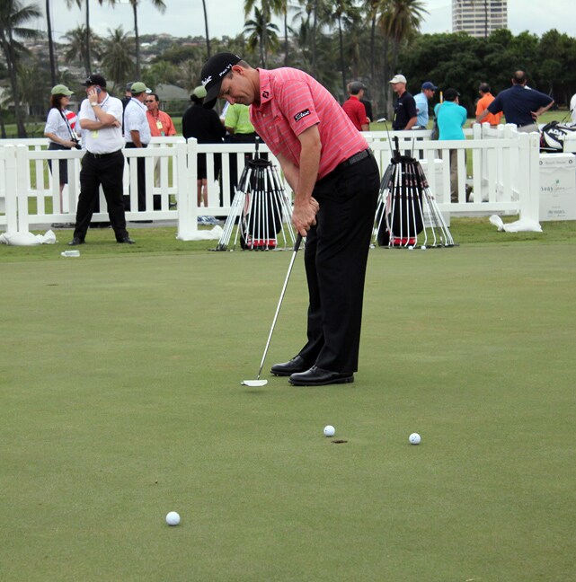 On the putting green, Titleist Brand Ambassador Jeff Klauk rolls in his Pro V1 from 5 feet. Aloha!