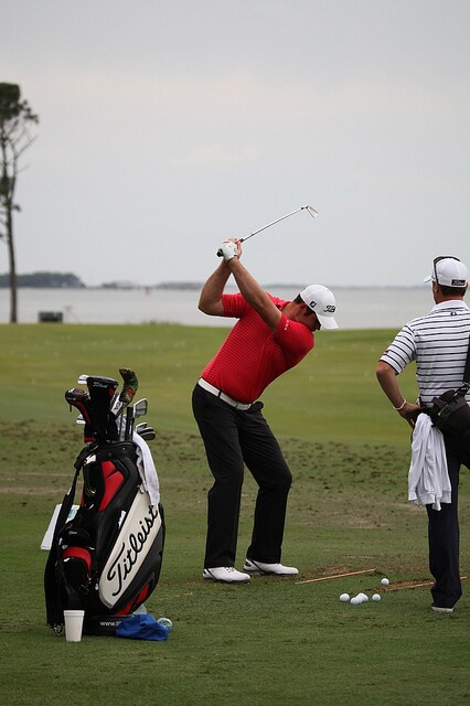 Moving down the range, Titleist Brand Ambassador Bobby Gates works on his alignment.