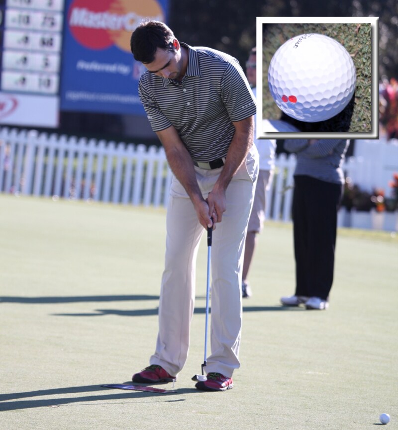 Titleist Brand Ambassador Cameron Tringale marks his Pro V1x with two dots on the side.
