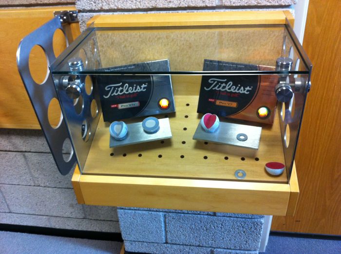Here's a display case featuring a look inside the Titleist Pro V1 and Pro V1x golf balls.