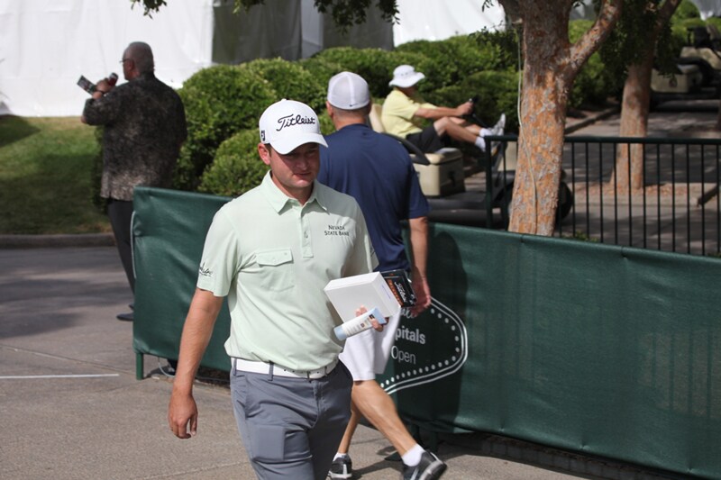 Titleist Brand Ambassador John Merrick carries a white box full of new Pro V1x prototype golf balls to the first tee during a practice round.