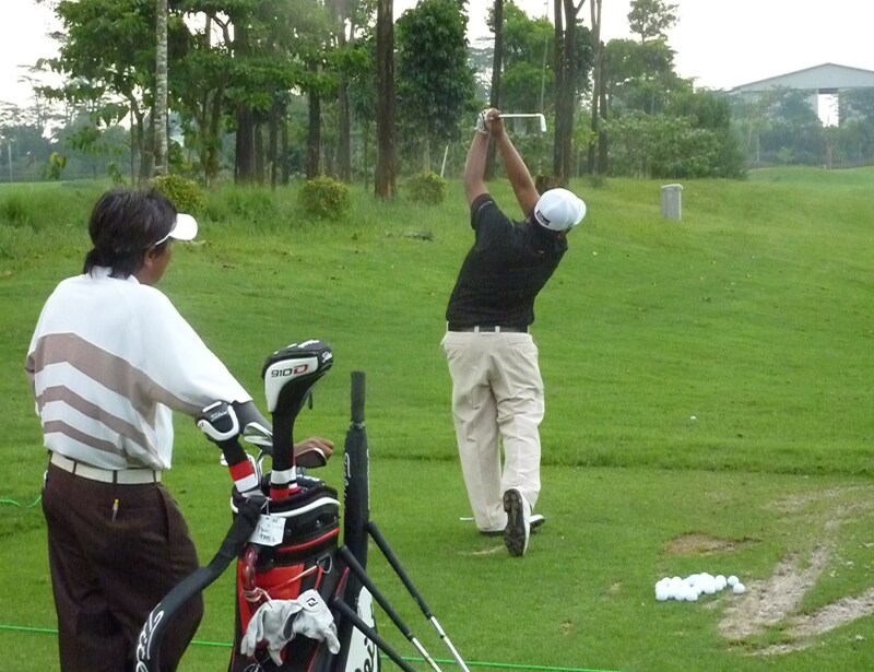 Benny Kasiadi hitting balls on the range with his dad giving him a few pointers.