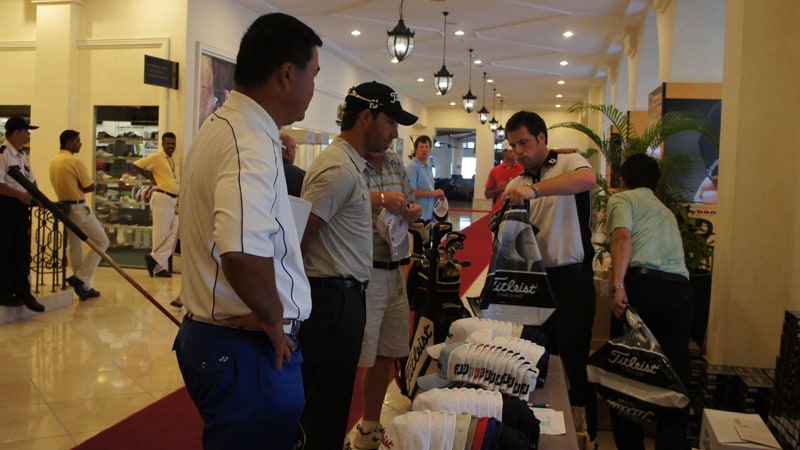 Pro V1X Loyalists Mardan Mamat and Pablo Larrazabal receiving their weeks golf balls from the Titleist Leadership Team.