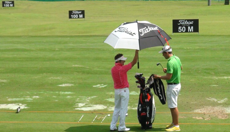 Despite how focused he is, Jbe's more than happy to hold the umbrella as his caddie gives his clubs a wipe. The umbrella is being used to block out the sun, not the rain, something you often don't see at the Singapore Open.