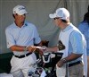 Nick's normal caddie, Chad Reynolds, hands Scott the day's pin sheet.