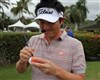 Titleist Brand Ambassador Ryuji Imada prepares for a putting drill by drawing a line around his Pro V1x golf ball.