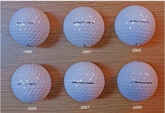 It's interesting to see how far the ProV has come. I don't remember the 1999 version (I think I was still playing Professional 90's), but the 2001 was a game changer. I really liked the 2009 version, and held on to those for awhile. I love the newest version with the white AIM line- best V yet. The ProV will always be the best ball in the game because it's continually improving. Kudos to the R&D down in Acushnet