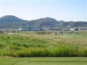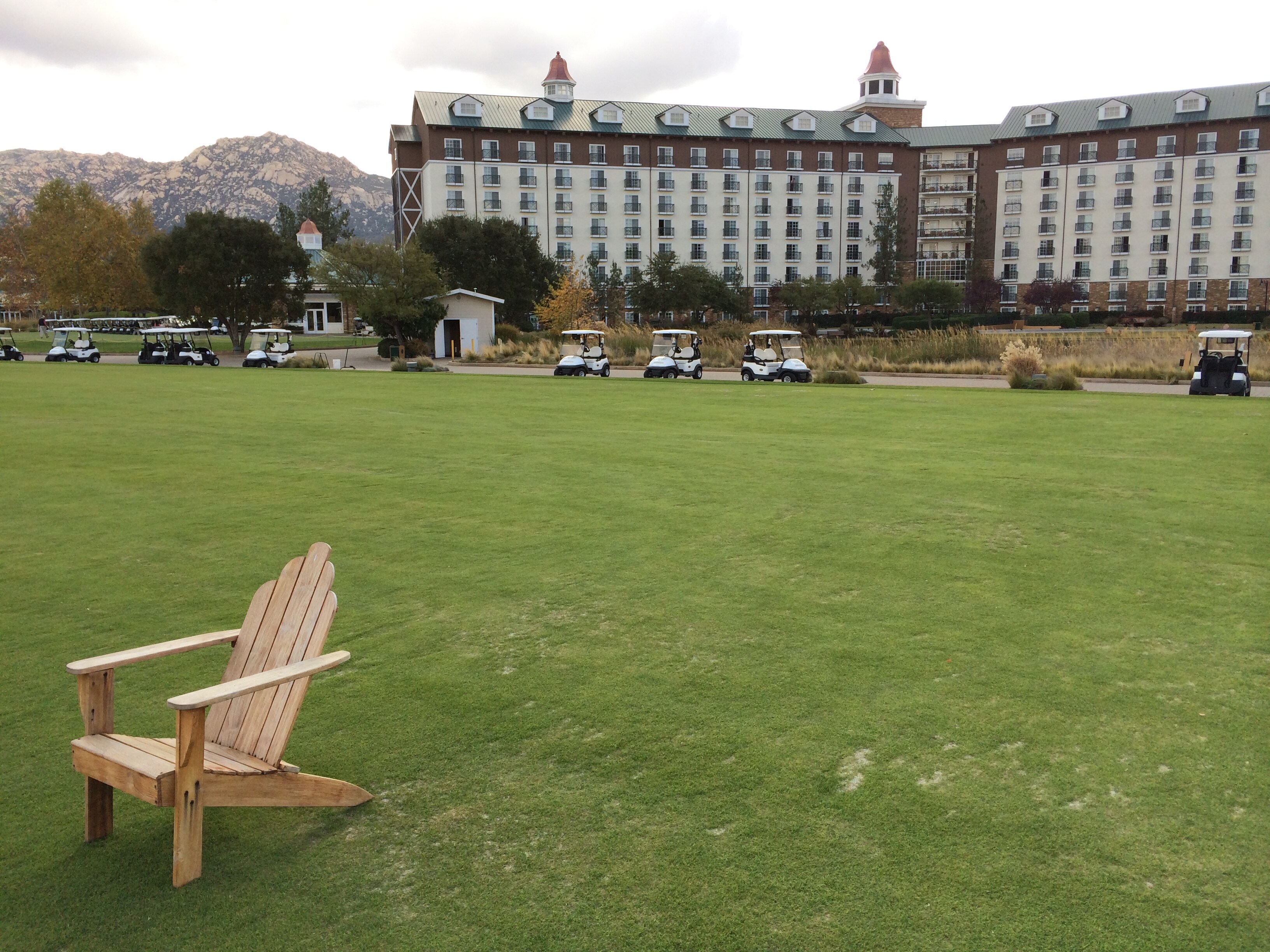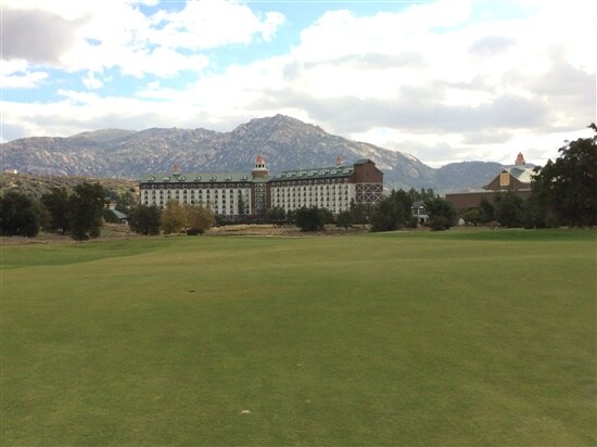 The driving range area with the hotel in the background amongst the foothills which surround the course.  Part of the course goes back into the mountains so hitting up and down off of small mountain areas was a blast! (Assuming you hit accurate shots! LOL).