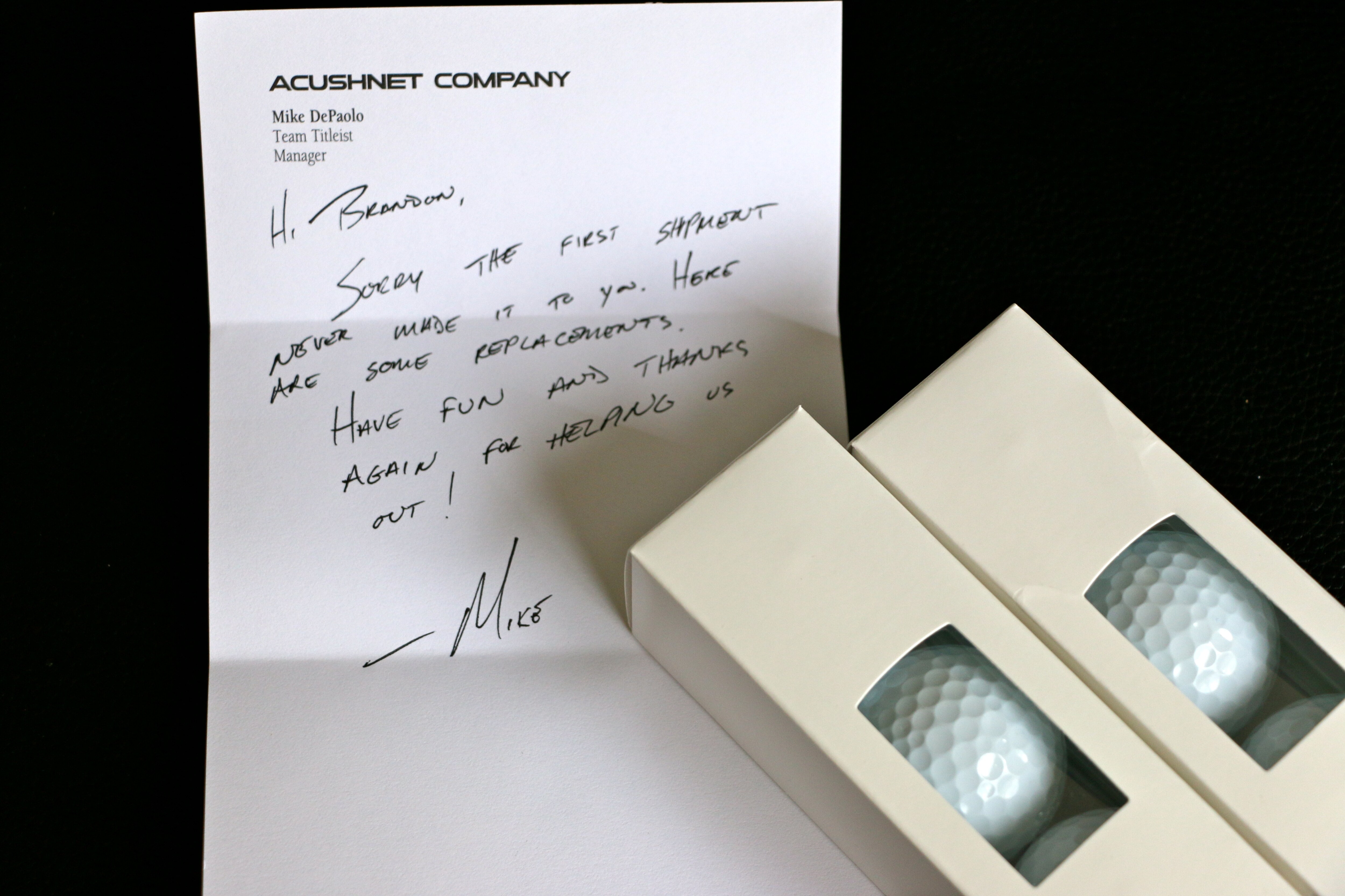 Today the door bell rang and knowing I had not spent my last paycheck on buying things online, I wasn't sure who it was. I opened the door and only a small box was left. As I began to open the box I realized it was from Titleist with a hand written note inside. Well as you can see, the image below speaks for itself.