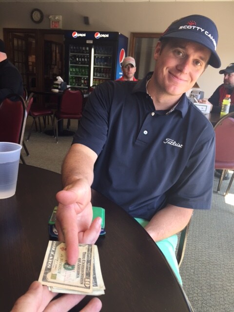 19th hole, time to pay up kid! He did it with pride but I have a feeling he's gonna get me back..