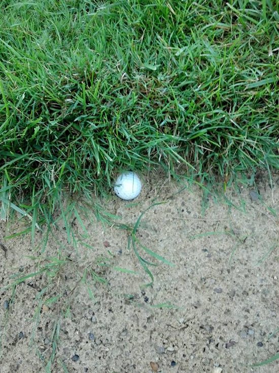 This was actually worse than the picture showed I believe it was actually "in the bunker" but right were the sand and turf meet.The bunker was under cut of the turf. I did play this shot. Got it out of the trap not on the green. Took boogie. Good news was I didn't hurt my self. Same lie again I'm taking the unplayable penilty the question then is do I drop in the sand or out?
