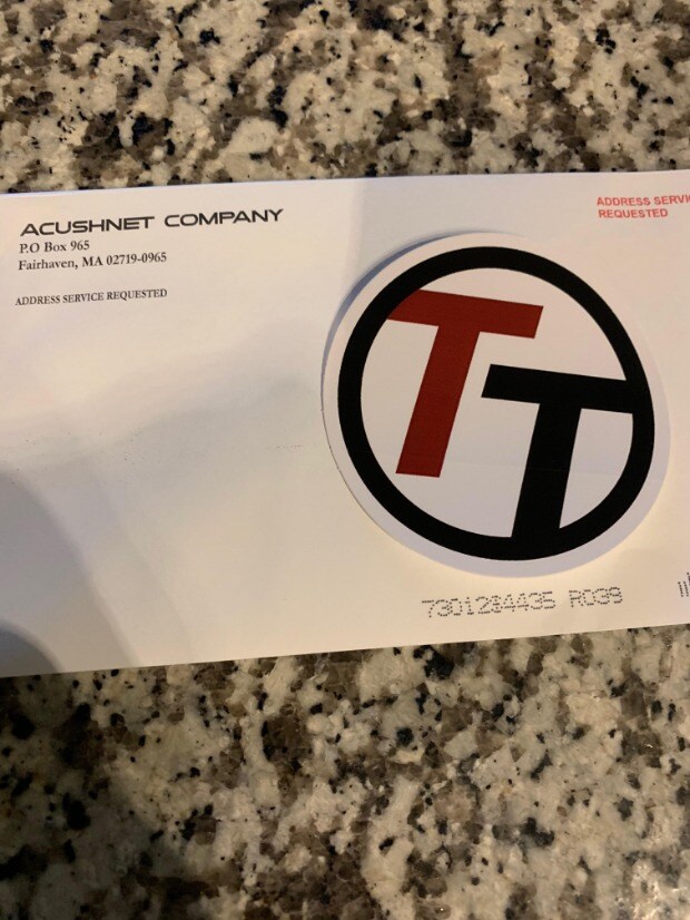 I had an envelope from Acushnet in the mail today. Inside was a cool TT sticker that looks just like the TT bag tag. I happen to love stickers! It made my day! Thank you for the cool surprise!