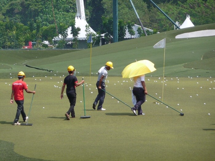 No carts to collect the range balls - a hard hat and a rake! Fore!